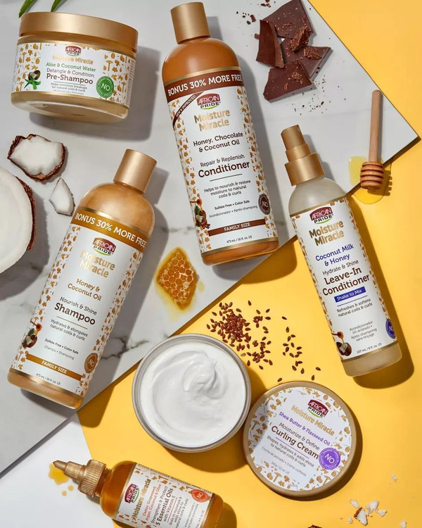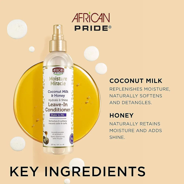 اسپری نرم کننده بعد حمام آفریکن پراید African Pride با داشتن عسل، روغن نارگیل، روغن بادام شیرین،روغن کرچک، روغن هسته انگور، روغن آووکادو، روغن دانه آفتابگردان و روغن زیتون به موهای فرفری شما استایل بدون وز و درخشش دلخواه را میدهد.