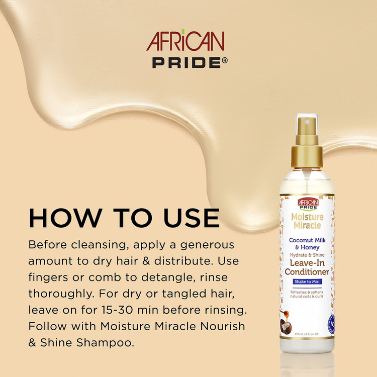 قبل از استفاده خوب اسپری نرم کننده بعد حمام آفریکن پراید African Pride آبرسان را تکان دهید.